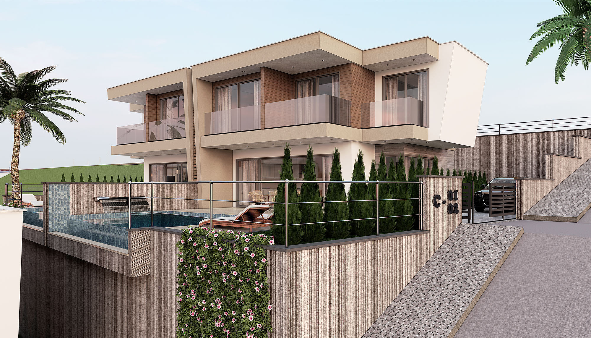 The villa project is an exquisite creation of modern architecture, consisting of blocks A, B, and C. Blocks A and B offer a generous living area of 500m², including a 300m² closed area and 200m² open area. With two bedrooms on the ground floor and three on the first floor, the villa provides a total of five bedrooms and a spacious living room for relaxation and socialization.